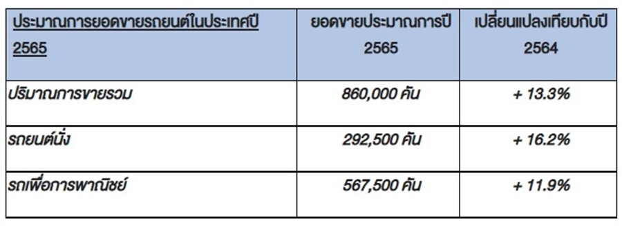 นอกจากนี้ ประชาชนเองก็เรียนรู้วิธีการใช้ชีวิตอยู่ร่วมกับสถานการณ์โรคโควิด-19 ให้ได้อย่างปลอดภัยแล้ว ส่วนปัญหาชิ้นส่วนการผลิตขาดตลาดก็จะค่อยๆ คลี่คลายลงเช่นกัน เราคาดหวังว่าอุตสาหกรรมยานยนต์จะกลับคืนสู่สภาวะปกติและคาดการณ์ว่ายอดขายรถยนต์ในปี 2565 จะอยู่ที่ 860,000 คัน หรือเพิ่มขึ้น 13.3% เมื่อเทียบกับปีที่แล้ว”