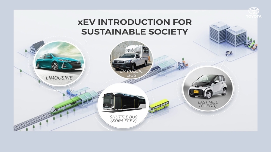 มร. ยามาชิตะ กล่าวว่า “ในประเทศไทยนั้น โตโยต้าเป็นผู้ริเริ่มแนะนำเทคโนโลยีด้านยานยนต์ไฟฟ้ามาตั้งแต่ปี 2552 โดยครองส่วนแบ่งการตลาดอยู่ถึง 80% และมีการใช้งานรถยนต์ไฟฟ้าของโตโยต้ามากที่สุดในภูมิภาคอาเซียน เราสามารถลดคาร์บอนไดออกไซด์ลงไปได้ 148,000 ตัน ซึ่งเท่ากับการปลูกต้นไม้ 2 ล้านต้น อีกทั้งในปีที่แล้ว เรายังได้ทำการแนะนำ เลกซัส UX300e ซึ่งเป็นรถยนต์ไฟฟ้าพลังงานแบตเตอรี่ และ เลกซัส NX450h+ ซึ่งเป็นรถยนต์ไฟฟ้าแบบปลั๊กอินไฮบริด