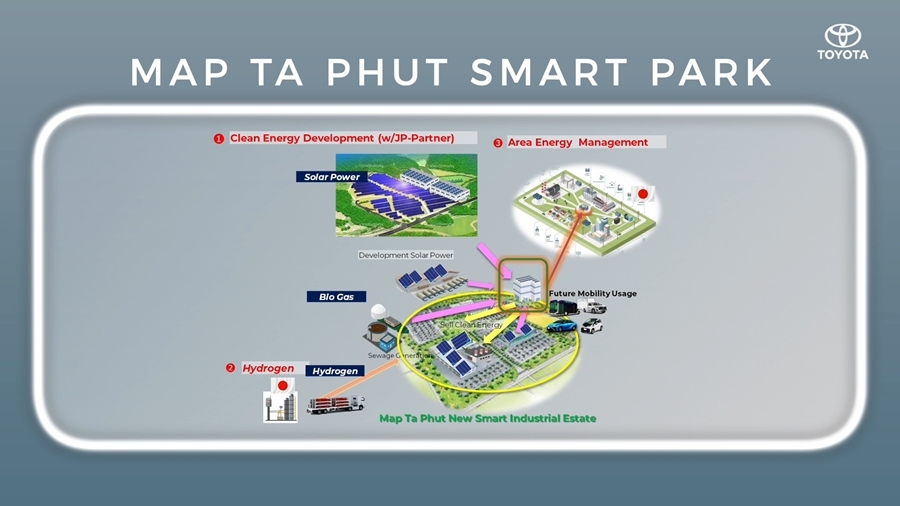 ตลอดทั้งวงจรชีวิตผลิตภัณฑ์ ยกตัวอย่างเช่น โครงการพัฒนาเมืองต้นแบบที่ยั่งยืนโดยปราศจากมลภาวะ ซึ่งเราจะสาธิตให้เห็นถึงการใช้รถยนต์พลังงานไฟฟ้าหลากหลายประเภทในการเดินทางคมนาคม ภายในเมืองพัทยา และเราได้เริ่มต้นศึกษาความเป็นไปได้ในการริเริ่มใช้โครงสร้างพื้นฐานพลังงานสะอาด เช่น ไฮโดรเจน พลังงานแสงอาทิตย์ และพลังงานชีวภาพ ใน นิคมอุตสาหกรรมมาบตาพุด อีกด้วย"