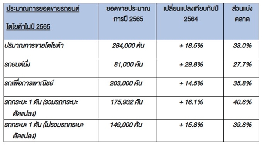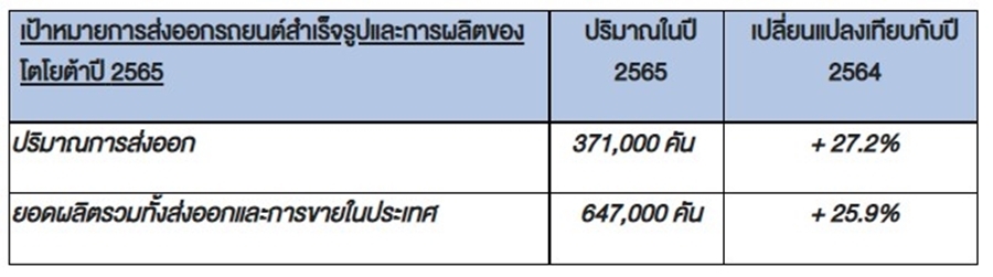 "สำหรับเป้าหมายการส่งออกรถยนต์สำเร็จรูปของโตโยต้าในปีนี้ เราคาดว่าความต้องการของตลาดต่างประเทศจะเพิ่มสูงขึ้น โดยเราตั้งเป้าปริมาณการส่งออกรถยนต์อยู่ที่ 371,000 คัน หรือเพิ่มขึ้น 27.2% เมื่อเทียบกับปีที่แล้ว และเราตั้งเป้าการผลิตรถยนต์ทั้งหมดของปี 2565 อยู่ที่ ราว 647,000 คัน หรือเพิ่มขึ้น 25.9% จากปีที่ผ่านมา"