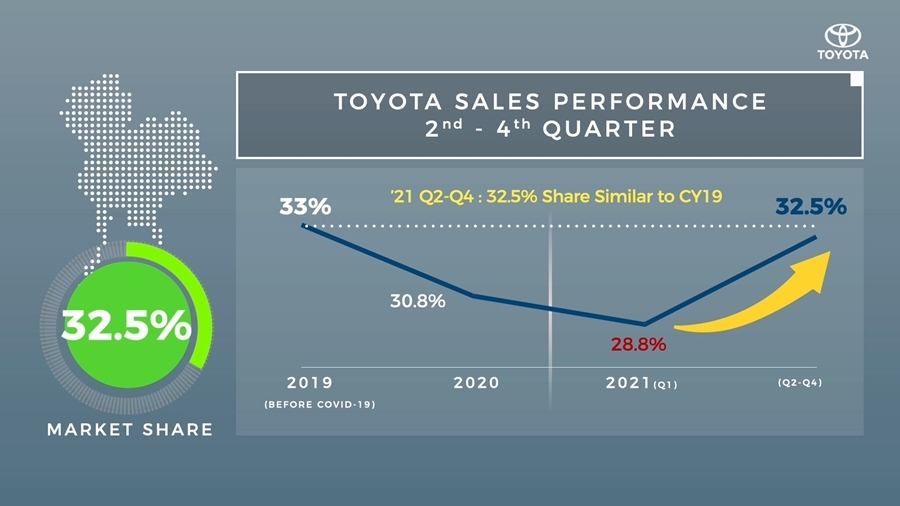 ถ้าเราลองดูที่ยอดขายของโตโยต้าในระหว่างช่วงไตรมาสที่ 2 ถึงไตรมาสที่ 4 จะเห็นได้ว่าส่วนแบ่งทางการตลาดของเราอยู่ที่ 32.5% ซึ่งเป็นระดับที่ไกล้เคียงกับในปี 2562 หรือช่วงก่อนที่โรคโควิด-19 จะระบาด โดยในส่วนของยอดขายของไฮลักซ์ รีโว่ นั้น มีส่วนแบ่งทางการตลาดอยู่ที่ 39.1% ซึ่งสูงกว่าของปี 2562 ในขณะที่ เอทีฟ และ ยาริส นั้น ก็สามารถครองอันดับ 1 ในตลาดรถอีโคคาร์"