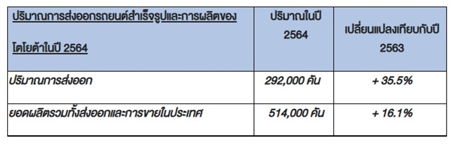 "ในด้านการส่งออกรถยนต์ ในปี 2564 โตโยต้าได้ส่งออกรถยนต์สำเร็จรูปไปราว 292,000 คัน หรือเพิ่มขึ้น 35.5% จากปี 2563 โดยยอดรวมการผลิตรถยนต์สำหรับการขายภายในประเทศและการส่งออกในปี 2564 มีจำนวนทั้งสิ้น 514,000 คัน หรือเพิ่มขึ้น 16.1% จากปี 2563"