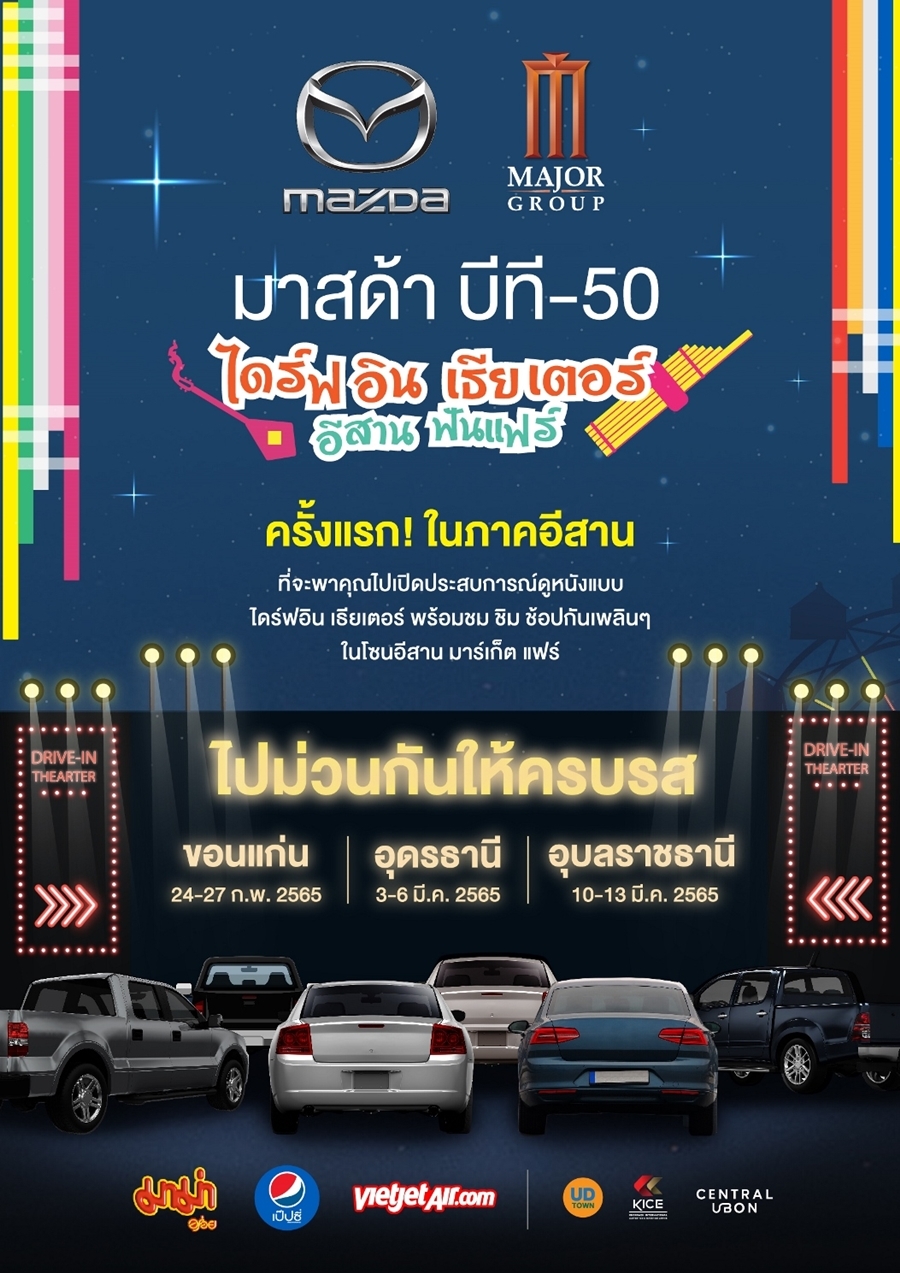มาสด้า บีที-50 ไดร์ฟอิน เธียเตอร์ อีสาน ฟันแฟร์ ประเดิมจัดครั้งแรกที่จังหวัดขอนแก่น ตามมาด้วยจังหวัดอุดรธานี และสุดท้ายที่จังหวัดอุบลราชธานี พร้อมเชิญชวนแฟนหนังร่วมสนุกลุ้นรับบัตรเข้าชมฟรี ผ่านกิจกรรมออนกราวด์และออนไลน์แพลตฟอร์ม โดยเริ่มต้นงานแรกที่จังหวัดขอนแก่นในระหว่างวันที่ 24 – 27 กุมภาพันธ์ 2565 นี้ ณ ศูนย์ประชุมและแสดงสินค้านานาชาติ KICE ตั้งแต่เวลา 16:00 น. เป็นต้นไป