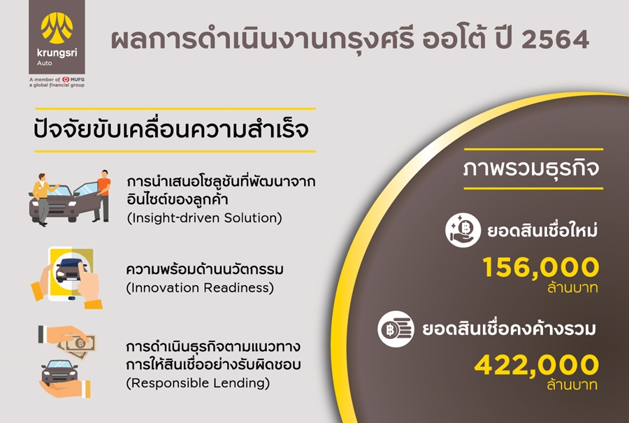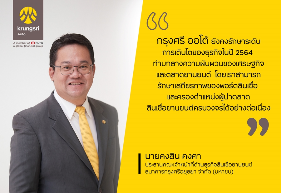 นายคงสิน คงคา ประธานคณะเจ้าหน้าที่ด้านธุรกิจสินเชื่อยานยนต์ ธนาคารกรุงศรีอยุธยา จำกัด (มหาชน) กล่าวว่า “ปี 2564 ยังคงเป็นช่วงเวลาที่เต็มไปด้วยความไม่แน่นอนจากการแพร่ระบาดของโควิด-19 ซึ่งส่งผลให้สภาวะเศรษฐกิจและตลาดยานยนต์ในทุกเซ็กเมนต์มีความผันผวนสูง โดยยอดขายรถยนต์ใหม่หดตัวลง 4% ในขณะที่ตลาดสินเชื่อยานยนต์โดยรวมปรับตัวลดลง 2.5% อย่างไรก็ดี กรุงศรี ออโต้ ยังคงรักษาระดับการเติบโตของธุรกิจ ด้วยมูลค่ายอดสินเชื่อใหม่ 156,000 ล้านบาท และยอดสินเชื่อคงค้างรวม 422,000 ล้านบาท”