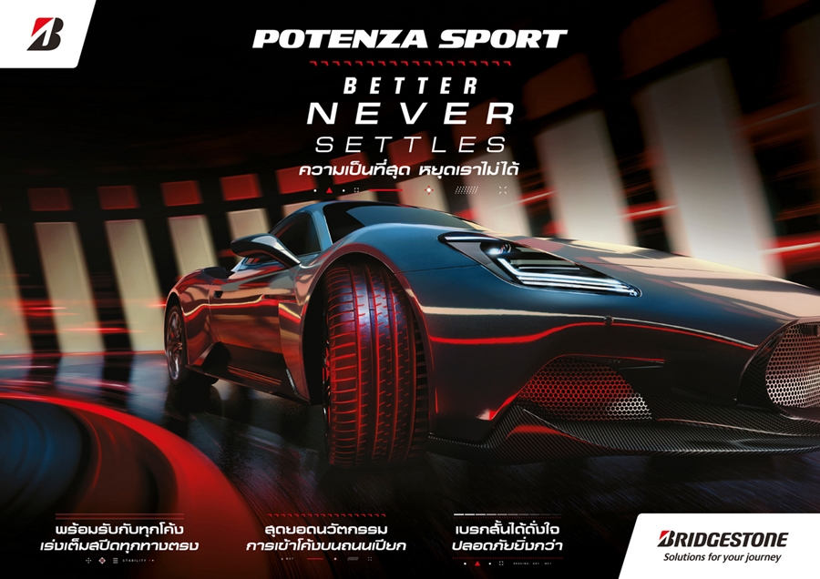 บริดจสโตน เปิดตัวผลิตภัณฑ์ POTENZA Sport รุ่นเรือธงใหม่ ภายใต้สโลแกน ความเป็นที่สุด หยุดเราไม่ได้ หรือ Better Never Settles ที่ได้รับการออกแบบโดยใช้เทคโนโลยียางอันล้ำสมัยและให้สมรรถนะการยึดเกาะถนนที่เหนือกว่า ภายใต้การควบคุมอย่างเต็มประสิทธิภาพ จัดเต็มสมรรถนะครบทุกฟังก์ชันแห่งความสปอร์ตในทุกการขับขี่