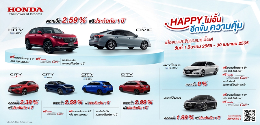 แฮปปี้ไม่อั้น อีกขั้นความคุ้ม ให้ลูกค้าเป็นเจ้าของรถยนต์ฮอนด้าได้ง่ายขึ้น ด้วยดอกเบี้ยพิเศษเริ่มต้น 0% ในงานบางกอก อินเตอร์เนชั่นแนล มอเตอร์ โชว์ ครั้งที่ 43 ณ บูทฮอนด้า (A9) อาคารชาเลนเจอร์ฮอลล์ 2 อิมแพ็ค เมืองทองธานี ตั้งแต่วันที่ 23 มีนาคม - 3 เมษายน 2565 และรับข้อเสนอเดียวกันนี้ได้ที่โชว์รูมฮอนด้าทั่วประเทศ เมื่อจองและรับรถยนต์ฮอนด้าตั้งแต่วันที่ 1 มีนาคม 2565 – 30 เมษายน 2565