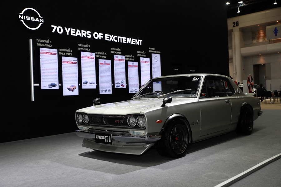 เนื่องในโอกาสครบรอบนี้ นิสสันภูมิใจที่ได้จัดแสดง จีที-อาร์ ซี10 (GT-R C10) รุ่นตำนานที่บูธนิสสัน หนึ่งในรถสปอร์ตที่แฟน ๆ ทั่วโลกต่างชื่นชอบมากที่สุด สกายไลน์ ซี10 (Skyline C10) ถือกำเนิดขึ้นในปี 1968 (พ.ศ. 2511) หลังจากมีการเปลี่ยนโฉม โดยมีชื่อเสียงที่ได้รับการขนานนามว่า ฮาโกะสึกะ ชื่อเล่นคือ Boxy Skyline ที่มาพร้อมกับฟีเจอร์ต่าง ๆ เช่น ลำตัวที่กว้างขึ้นและลดต่ำลง และมีสไตล์ที่โฉบเฉี่ยว โดยเฉพาะอย่างยิ่ง character line ที่บังโคลนหลังและออกแบบตามอุทกพลศาสตร์ (hydrodynamics) สำหรับผู้ที่ชื่นชอบมอเตอร์สปอร์ต