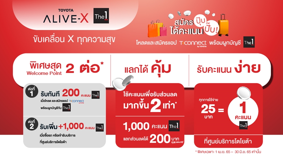 “The 1 มีความมั่นใจว่าโครงการ Toyota ALIVE-X ในครั้งนี้จะประสบความสำเร็จ และได้มอบประโยชน์สูงสุดให้กับลูกค้าของโตโยต้า และสมาชิก The 1 ได้อย่างกว้างขวาง ทั้งหมดนี้ เป็นไปตามแนวคิดร่วม ‘Customer First’ ที่จะมอบประสบการณ์ที่ดีที่สุดให้กับลูกค้าเสมอ และที่สำคัญ The 1 ยังคงไม่หยุดยั้งที่จะขยาย Eco system และเปิดรับแบรนด์ใหม่ๆ ที่จะมาร่วมกลุ่มพันธมิตร และเมื่อต้นปีที่ผ่านมาเราได้เปิดตัวบริการ The 1 for Business นำเสนอ Solution ที่จะช่วยเพิ่มขีดความสามารถในการทำธุรกิจให้กับ Partner ด้วยความเชี่ยวชาญด้าน Loyalty Program พร้อมด้วยข้อได้เปรียบด้านข้อมูลของ The 1 ที่มีความเข้าใจสมาชิกแบบ 360 องศา และโครงการ Toyota ALIVE-X บน T-Connect Application ในครั้งนี้ถือเป็นอีกก้าวสำคัญของ The 1 ในการขยาย Eco system ให้ตอบสนองความต้องการของสมาชิก The 1 ได้ครอบคลุมทุกไลฟ์สไตล์ พร้อมร่วมออกแบบสิทธิประโยชน์ตรงใจให้กับลูกค้าของโตโยต้า อีกด้วย”