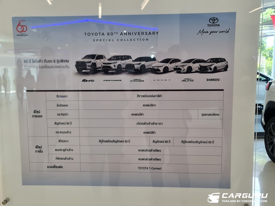 ในวาระโอกาสครบรอบ 60 ปี โตโยต้า ก็ได้มีแผนที่จะทำการแนะนำรถยนต์ "รุ่นพิเศษฉลองครบรอบ 60 ปี" จำหน่ายในจำนวนจำกัด 6,000 คัน ซึ่งจะประกาศราคากันในปลายเดือน พฤษภาคมนี้ รวมถึงมีการจัดเตรียมกิจกรรมและแคมเปญพิเศษต่างๆ มากมาย เพื่อเป็นการร่วมฉลองกับลูกค้าโตโยต้าทุกคนในโอกาสพิเศษนี้อีกด้วย