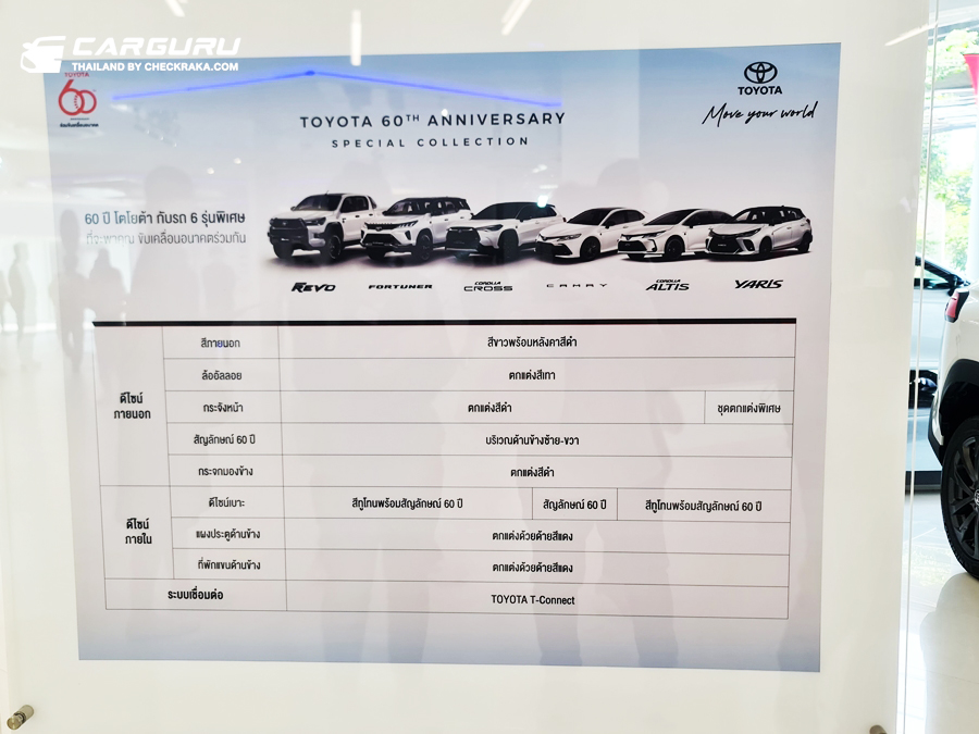 โครงการ TOYOTA ALIVE ไปเมื่อไม่นาน ในวันงานยังจัดเซอร์ไพร์สในวาระโอกาสครบรอบ 60 ปี ซึ่งโตโยต้า มีแผนที่จะทำการแนะนำรถยนต์ "รุ่นพิเศษฉลองครบรอบ 60 ปี" จำหน่ายในจำนวนจำกัดแค่ 6,000 คัน เท่านั้น รวมถึงมีการจัดเตรียมกิจกรรมและแคมเปญพิเศษต่างๆ มากมาย เพื่อเป็นการร่วมฉลองกับลูกค้าโตโยต้าทุกคนในโอกาสพิเศษนี้อีกด้วย จะมีรุ่นอะไรน่าสนใจ และปรับเปลี่ยนอะไรไปบ้างมาดูกัน