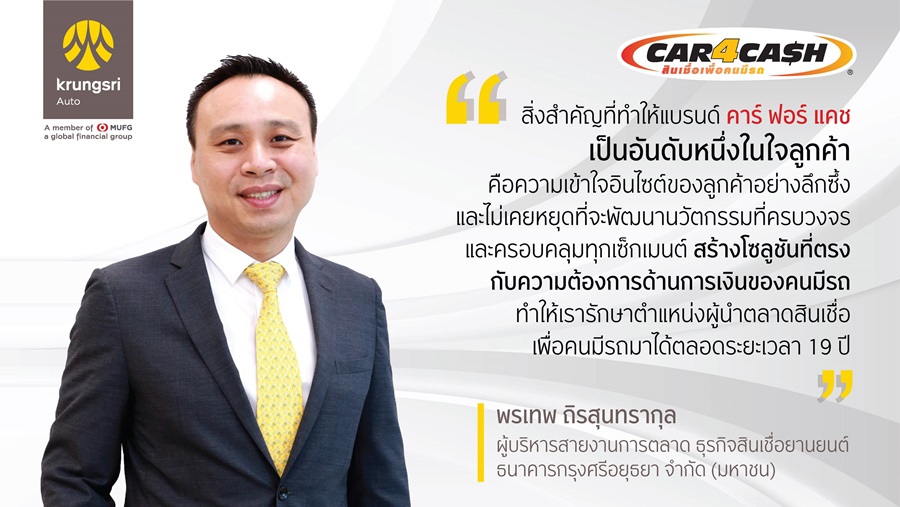 นายพรเทพ ถิรสุนทรากุล ผู้บริหารสายงานการตลาด ธุรกิจสินเชื่อยานยนต์ ธนาคารกรุงศรีอยุธยา จำกัด (มหาชน) กล่าวว่า “ตลาดสินเชื่อเพื่อคนมีรถยังคงมีแนวโน้มเติบโตต่อเนื่องจากหลายปัจจัย ทั้งความต้องการสินเชื่อที่ยังอยู่ในระดับสูง และนวัตกรรมผลิตภัณฑ์ใหม่ๆ จากผู้ให้บริการสินเชื่อ สำหรับ คาร์ ฟอร์ แคช ซึ่งเป็นแบรนด์ผู้บุกเบิกตลาดรีไฟแนนซ์รถในประเทศไทย เราให้ความสำคัญกับการพัฒนาผลิตภัณฑ์และบริการที่เข้าถึงความต้องการด้านการเงินของคนมีรถในทุกกลุ่ม ขณะเดียวกัน เรายังมุ่งมอบประสบการณ์ที่ดีในทุกจุดของ Customer Journey ซึ่งทำให้ คาร์ ฟอร์ แคช ยังคงครองตำแหน่งผู้นำตลาดมาตลอด 19 ปี ด้วยฐานลูกค้าปัจจุบัน 312,000 ราย และพอร์ตสินเชื่อมูลค่ารวม 80,220 ล้านบาท”