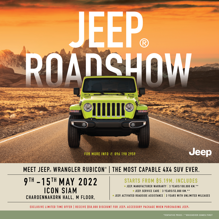 จี๊ป ประเทศไทย จะเปิดตัวโชว์รูม พร้อมศูนย์บริการมาตรฐานแห่งแรกบนถนนสุขุมวิทเร็วๆ นี้ และเชิญมาสัมผัส Jeep Wrangler Rubicon ได้แล้ว วันนี้ ถึง 15 พฤษภาคม ณ เจริญนครฮอลล์ ชั้น M ศูนย์การค้าไอคอนสยาม