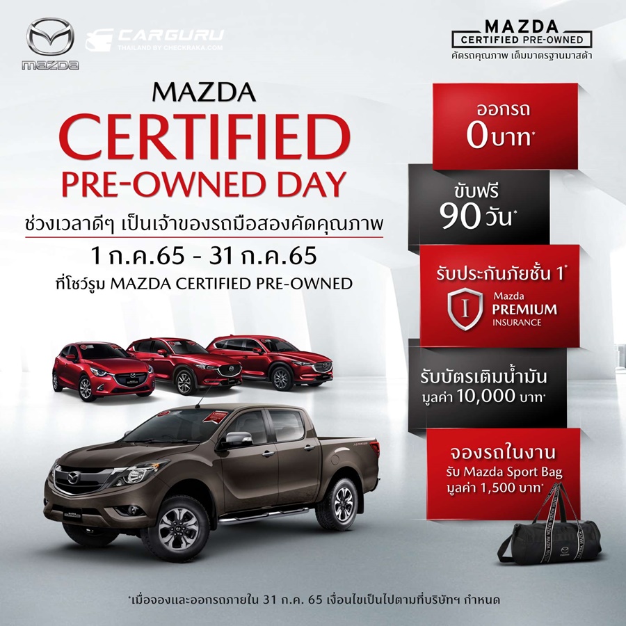 นอกจากจะมุ่งมั่นดูแลลูกค้ารายใหม่ที่กำลังจะเข้าสู่ครอบครัวมาสด้าแล้ว มาสด้ายังเอาใจใส่ดูแลลูกค้าเก่าอย่างใกล้ชิด เพื่อให้ลูกค้ามีทางเลือกที่ดีกว่า โดยลูกค้าที่ใช้รถยนต์มาสด้าอยู่แล้วสามารถนำรถมาเทรดอินกับรถใหม่ป้ายแดงหรือรถมือสองคุณภาพดี ที่ผ่านการรับรองมาตรฐานด้วยการตรวจสอบคุณภาพกว่า 119 จุด ภายใต้โครงการ MAZDA CERTIFIED PRE-OWNED กับแคมเปญ MAZDA CERTIFIED PRE-OWNED DAY ช่วงเวลาดีๆ เป็นเจ้าของรถมือสองคัดสรรคุณภาพที่ดีที่สุด มาพร้อมข้อเสนอออกรถเพียง 0 บาท*, ขับฟรี 90 วัน*, รับประกันภัยชั้น 1 Mazda Premium Insurance*, รับบัตรเติมน้ำมัน มูลค่า 10,000 บาท* และพิเศษจองรถในงานฯ รับ Mazda Sport Bag มูลค่า 1,500 บาท* ระหว่างวันที่ 1-31 ก.ค. 65 ที่โชว์รูม MAZDA CERTIFIED PRE-OWNED ทั่วประเทศ