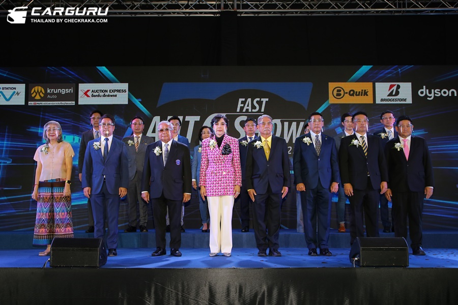 มร. เคนสุเกะ โยชิดะ กรรมการบริษัท ไทยบริดจสโตน จำกัด และบริษัท บริดจสโตนเซลส์ (ประเทศไทย) จำกัด (ที่สามจากซ้าย) พร้อมด้วย คุณพัฒนเดช อาสาสรรพกิจ (กลาง) และคุณอัษฎาวุธ อาสาสรรพกิจ (ที่สามจากขวา) ในพิธีเปิดงาน Fast Auto Show Thailand 2022