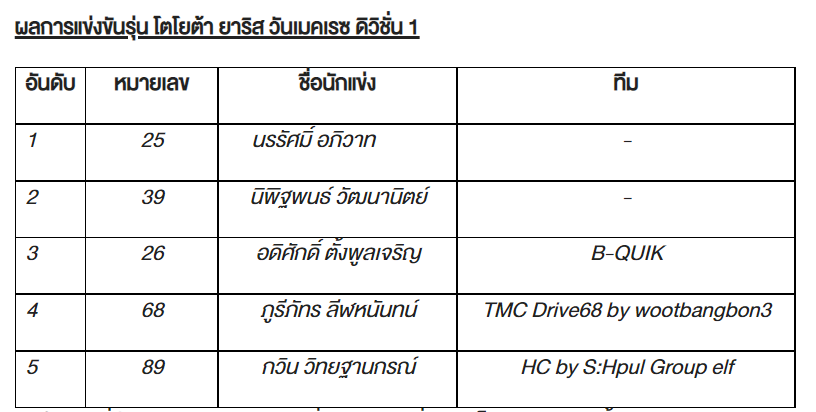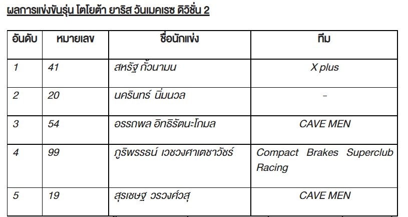 ในขณะที่รุ่น "ยาริส วันเมคเรซ ดิวิชั่น2” อันดับที่ 1 ตกเป็นของ “สหรัฐ กั้วนามน” หมายเลข 41 โดยมี “นครินทร์ นิ่มนวล” หมายเลข 20 คว้าอันดับที่ 2 ในขณะที่อันดับที่ 3 ตกเป็นของ “อรรถพล อิทธิรัตนะโกมล” หมายเลข 54