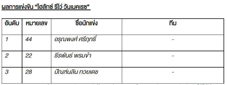 ปิดท้ายการแข่งขันสนามแรกด้วยนักขับรุ่นใหญ่ ไฮลักซ์ รีโว่ วันเมคเรซ ซึ่งจะแสดงสมรรถนะความแกร่งเหนือระดับ จากเครื่องยนต์ GD Super Power 2,400 ซีซี ผลปรากฏว่าอันดับที่ 1 ตกเป็นของ “อรุณพงศ์ ศรีฤทธิ์” หมายเลข 44 อันดับ 2 ได้แก่ “ธีรพันธ์ พรมขำ” หมายเลข 22 และอันดับ 3 ได้แก่ “ปัณฑ์นลิน ทวยเดช” หมายเลข 28