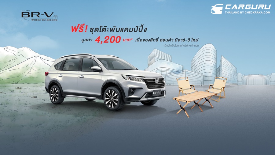 พิเศษ ลูกค้าที่จองสิทธิ์ ฮอนด้า บีอาร์-วี ใหม่ ระหว่างวันที่ 27 กรกฎาคม 2565 เวลา 10.00 น. ถึงวันที่ 18 สิงหาคม 2565** เวลา 22.00 น. รับฟรีชุดโต๊ะพับแคมป์ปิ้ง มูลค่า 4,200 บาท** โดยจะได้รับสิทธิ์เมื่อจองและรับรถภายในระยะเวลาที่บริษัทฯ กำหนด** สามารถจองสิทธิ์ผ่านที่ปรึกษาการขายฮอนด้าหรือที่โชว์รูมฮอนด้าทั่วประเทศ ทั้งนี้