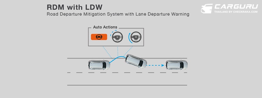- ระบบเตือนและช่วยควบคุมเมื่อรถออกนอกช่องทางเดินรถ (Road Departure Mitigation System with Lane Departure Warning: RDM with LDW)