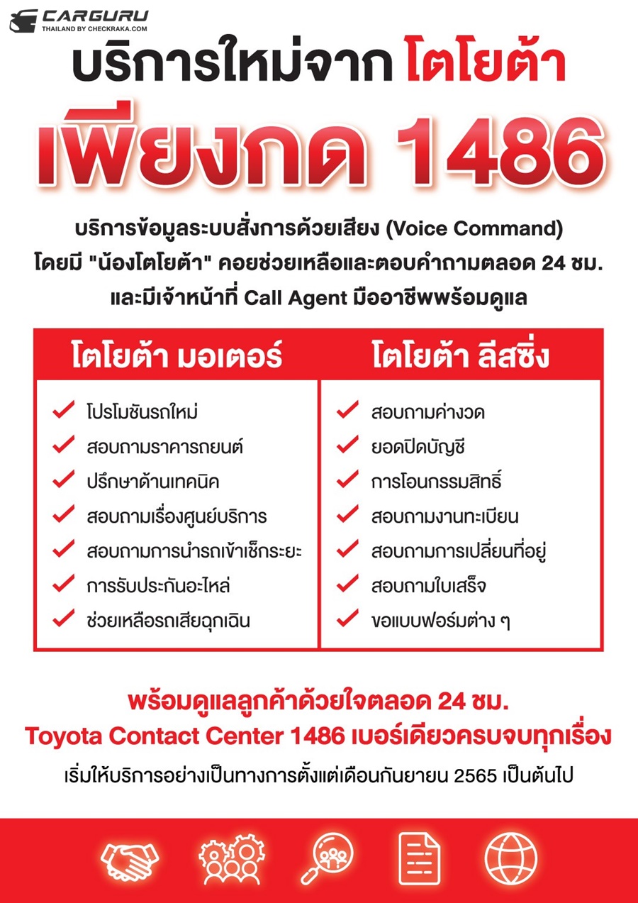 บริษัท โตโยต้า มอเตอร์ ประเทศไทย จำกัด ร่วมกับ บริษัท โตโยต้า ลีสซิ่ง (ประเทศไทย) จำกัด นำเสนอบริการใหม่เพื่อเพิ่มความสะดวกในการใช้บริการให้กับลูกค้า ด้วยการรวมศูนย์บริการข้อมูลลูกค้า ผ่านหมายเลขโทรศัพท์ 1486 ตลอด 24 ชม.