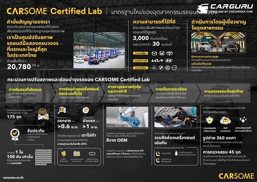 CARSOME แพลตฟอร์มอีคอมเมิร์ซซื้อขายรถยนต์มือสองครบวงจรที่ใหญ่ที่สุดในเอเชียตะวันออกเฉียงใต้ เปิดตัว ศูนย์ปรับสภาพและซ่อมบำรุงรถยนต์มือสอง (CARSOME Certified Lab) แห่งแรกในประเทศไทย เพื่อเดินหน้ายกระดับมาตรฐานใหม่ให้กับวงการรถยนต์มือสองในไทย โดยศูนย์ฯ แห่งนี้ครอบคลุมพื้นที่กว่า 20,780 ตารางเมตร พร้อมความสามารถในการปรับสภาพและซ่อมบำรุงได้สูงสุดถึง 3,000 คันต่อเดือน ถือเป็นศูนย์ปรับสภาพรถยนต์มือสองที่ใหญ่ที่สุดในไทย