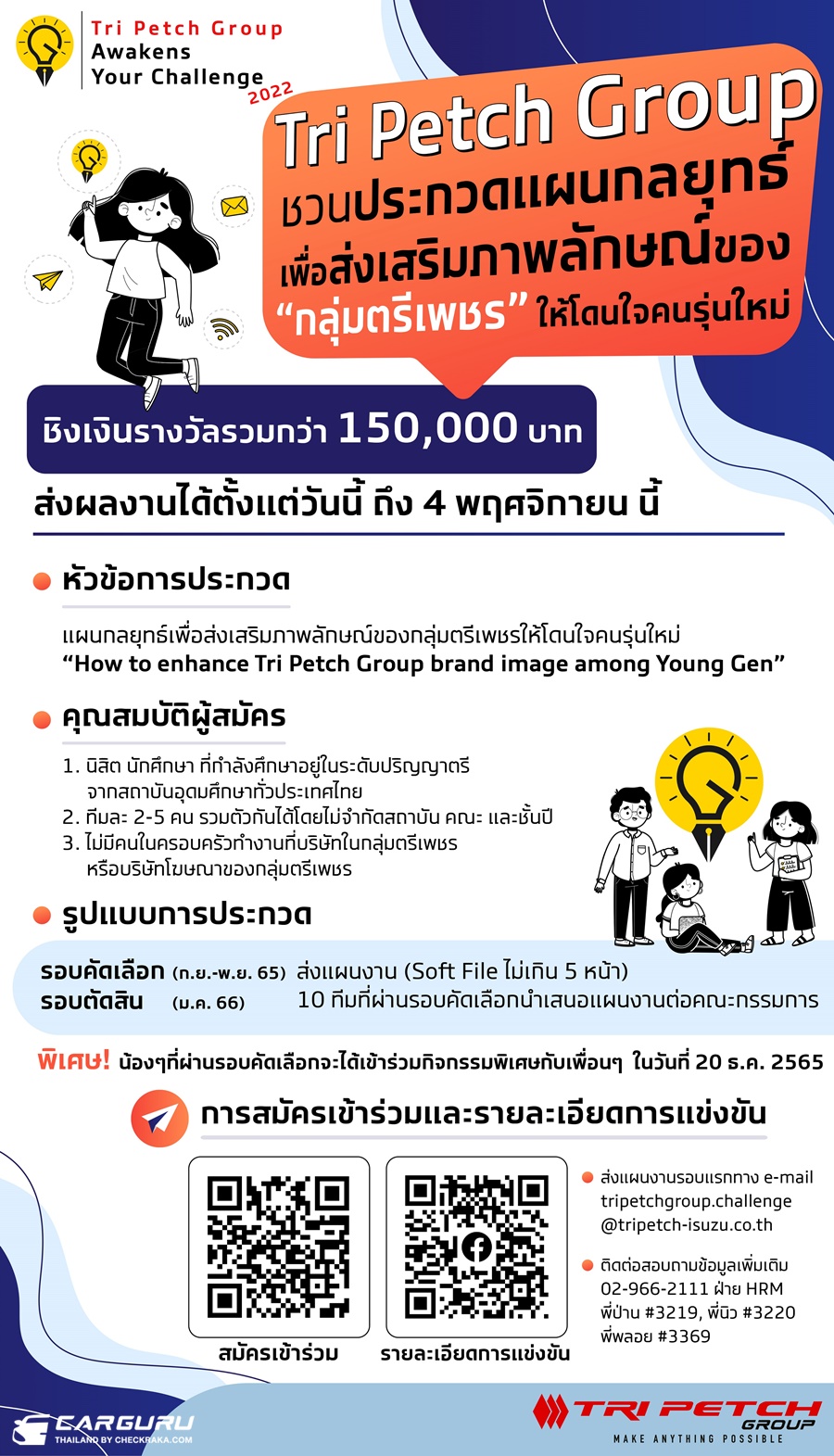 หมดเขตการรับสมัครและส่งผลงานวันที่ 4 พฤศจิกายน 2565 สามารถสมัครโดยสแกน QR Code ด้านล่าง หรือศึกษาข้อมูลและรายละเอียดของโครงการเพิ่มเติมได้ที่ Facebook: Tri Petch Group Awakens Your Challenge