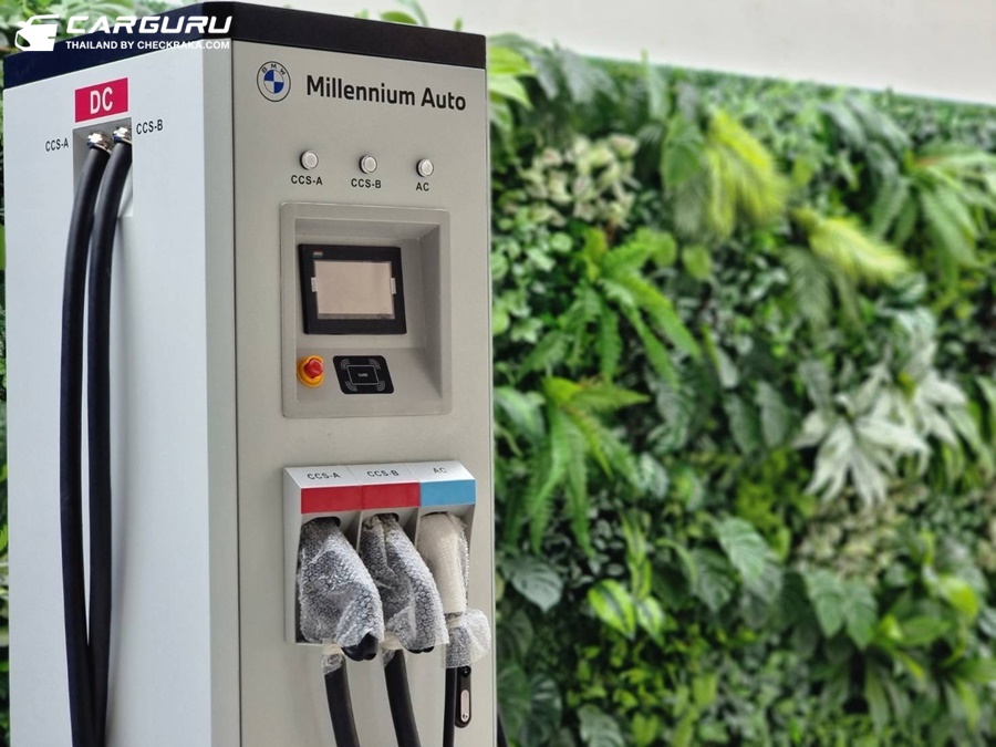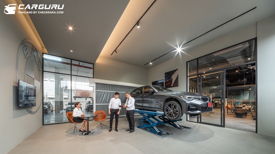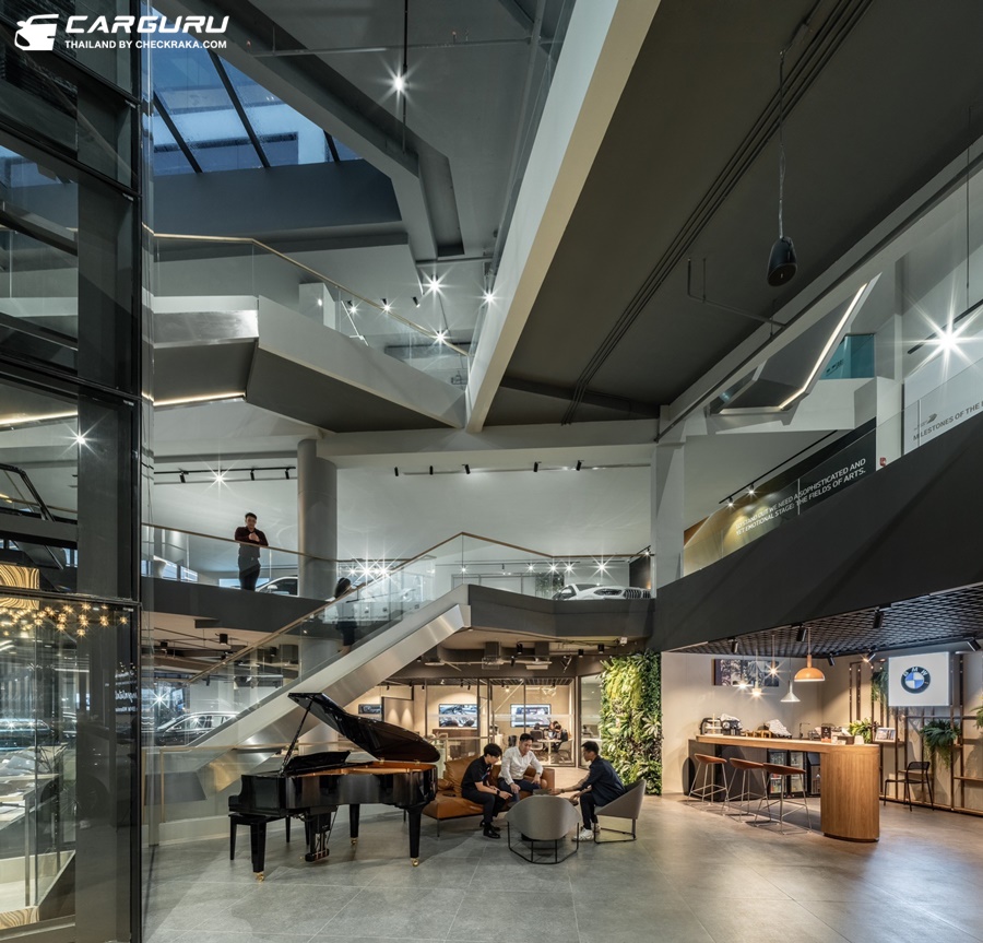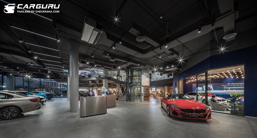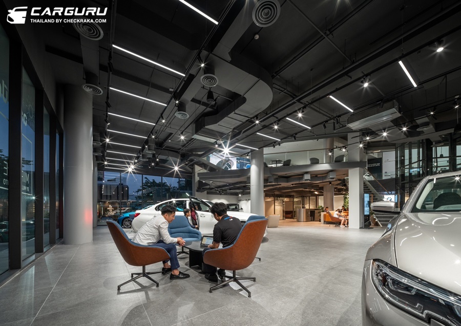 ภายใต้หลังคาแผ่นใหญ่บริเวณหน้าโชว์รูม ปกป้องลูกค้าจากแสงแดดหรือสายฝน ติดตั้งแท่นชาร์จความเร็วสูง (DC-Direct Current Charger) รองรับรถยนต์ไฟฟ้าของ บีเอ็มดับเบิลยู โถงจัดแสดงหลักชั้นล่าง สว่างไสวด้วยแสงธรรมชาติจากเพดานกระจก ขณะที่ลิฟต์แก้วบริเวณกลางโชว์รูม ช่วยให้ลูกค้าสามารถชื่นชมความโดดเด่นของโชว์รูมแห่งนี้ได้อย่างรอบด้าน