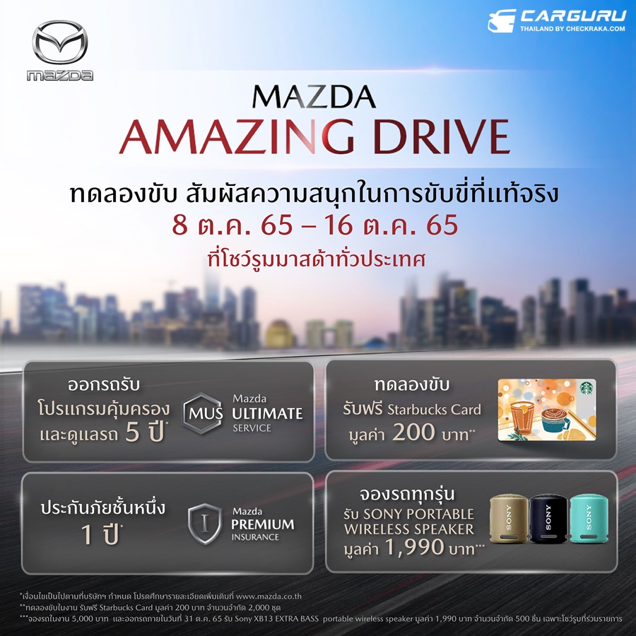 พร้อมกันนี้ในเดือนตุลาคม มาสด้ายังได้มอบข้อเสนอสุดพิเศษให้กับลูกค้าที่ต้องการออกรถใหม่ด้วยกิจกรรมสุดพิเศษ Mazda Amazing Drive ทดลองขับสัมผัสความสนุกในการขับขี่ที่แท้จริง ระหว่างวันที่ 8 – 16 ตุลาคม 2565 ที่โชว์รูมมาสด้าทั่วประเทศ ทดลองขับรถยนต์มาสด้าทุกรุ่น รับฟรี Starbucks Card มูลค่า 200 บาท* และเมื่อออกรถ รับฟรี Mazda Ultimate Service (MUS) หรือ โปรแกรมคุ้มครองและดูแลรถ 5 ปี* ฟรีประกันภัยชั้นหนึ่ง Mazda Premium Insurance (MPI) 1 ปี* และลำโพง Sony Portable Wireless Speaker มูลค่า 1,990 บาท*