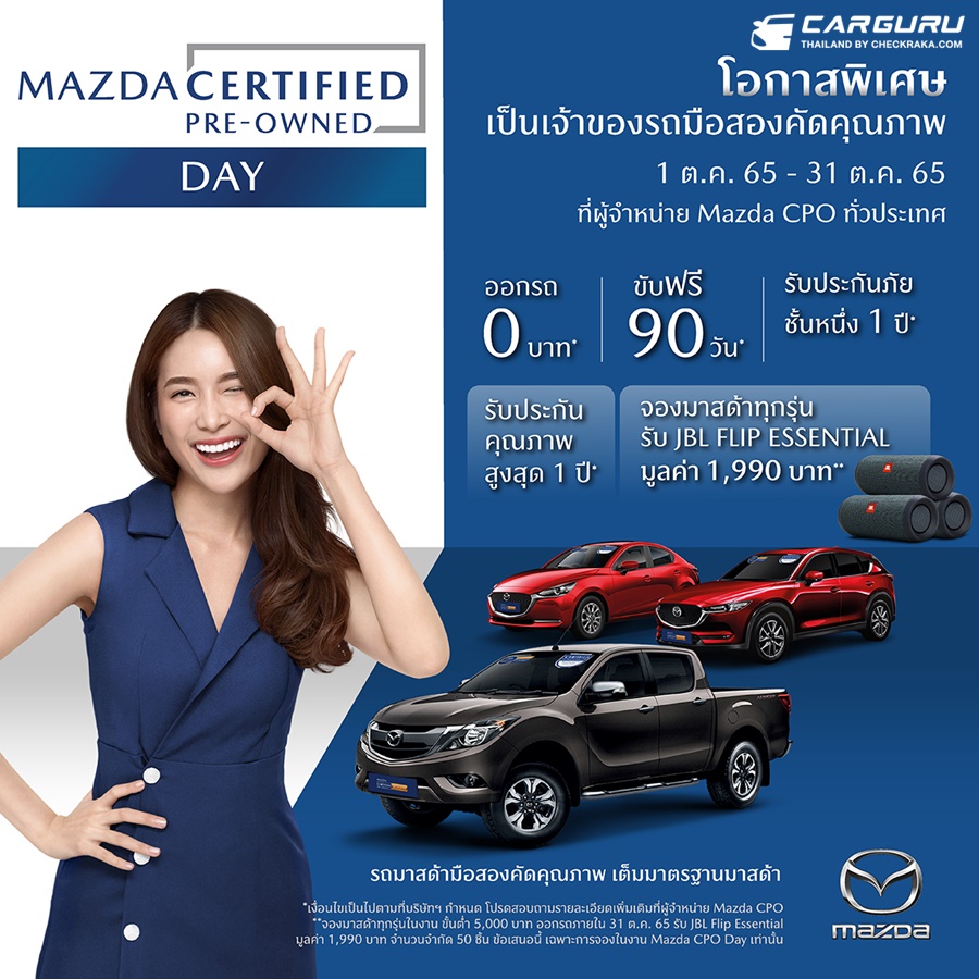 นอกจากนี้ มาสด้ายังเปิดโอกาสให้ลูกค้าได้เป็นเจ้าของรถยนต์มือสองคัดคุณภาพ ในงาน Mazda Certified Pre-Owned Day พบกับข้อเสนอ ออกรถ 0 บาท** ขับฟรี 90 วัน** รับประกันภัยชั้นหนึ่ง 1 ปี** รับประกันคุณภาพสูงสุด 1 ปี** และจองมาสด้าทุกรุ่นรับ JBL Flip Essential มูลค่า 1,990 บาท** ระหว่างวันที่ 1-31 ต.ค. 65 ที่ผู้จำหน่าย Mazda CPO ทั่วประเทศ