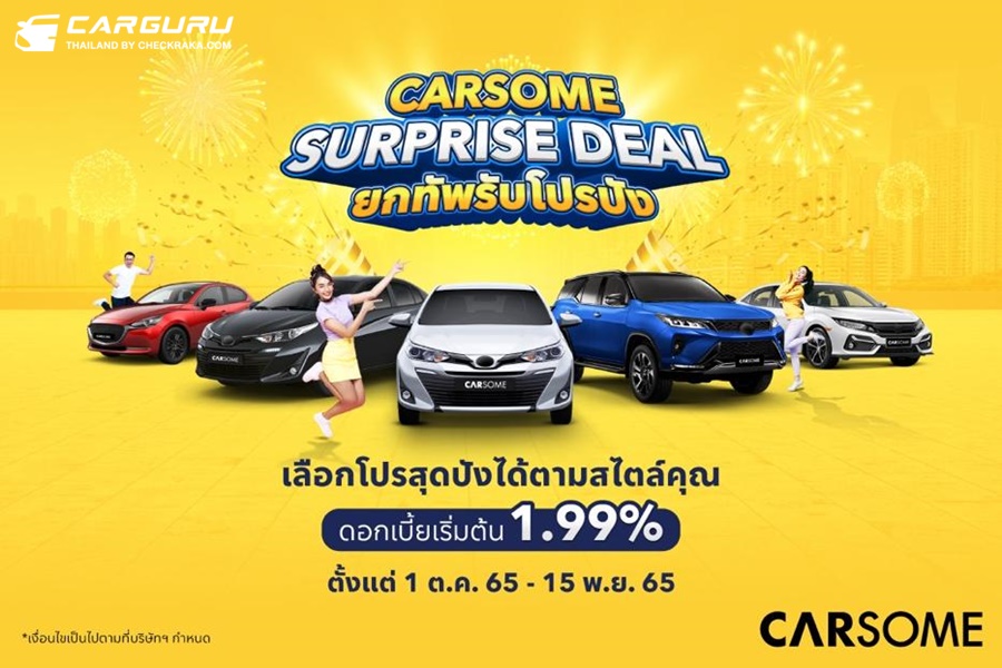 Surprise Deal ซึ่งจะมีถึงวันที่ 15 พฤศจิกายน 2565 นี้เท่านั้น โดยลูกค้าของ CARSOME จะได้รับดอกเบี้ยอัตราเริ่มต้นเพียงแค่ 1.99% จากลีสซิ่งกสิกรไทย หรือเลือกรับส่วนลดสูงสุด 20,000 บาท ขยายเวลารับประกัน 2 ปี หรือ 40,000 กิโลเมตร พร้อมรับฟรีกล้องติดรถยนต์จาก Xiaomi เมื่อโพสต์รีวิวบนเพจเฟสบุ๊ค CARSOME Thailand และส่วนลดพิเศษสำหรับแพ็กเกจตรวจสภาพรถจาก FIT Auto โดย บริษัท ปตท. น้ำมันและการค้าปลีก จำกัด (มหาชน) หรือ OR อ่านรายละเอียดและเงื่อนไขเพิ่มเติมเกี่ยวกับแคมเปญ Super Deal ได้