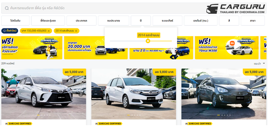 www.carsome.co.th คุณสามารถกำหนดปีเพื่อกรองดูรถที่อยู่ในช่วงอายุที่คุณรับได้ อย่างไรก็ตาม จำเป็นต้องทราบว่าอายุการใช้งานรถยนต์เป็นปัจจัยสำคัญที่ส่งผลต่อราคาเช่นเดียวกัน