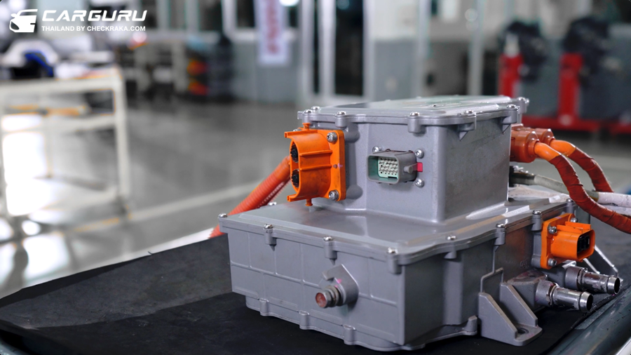 •ระบบชาร์จไฟฟ้าแบบออนบอร์ด (OBC: On-Board Charger): ทำหน้าที่แปลงกระแสไฟฟ้าจากกระแสสลับ (AC) เป็นกระแสตรง (DC) ในการชาร์จไฟกลับเข้าสู่แบตเตอรี่ หรือจ่ายไฟแรงดันสูงจากกระแสตรง (DC) เป็นกระแสสลับ (AC) ให้มอเตอร์ขับเคลื่อน และอีกหน้าที่คือแปลงไฟฟ้ากระแสตรงแรงดันสูงให้กลายเป็นไฟฟ้ากระแสตรงแรงดันต่ำ เพื่อชาร์จไฟกลับเข้าสู่แบตเตอรี่แรงดันต่ำ 12 โวลต์