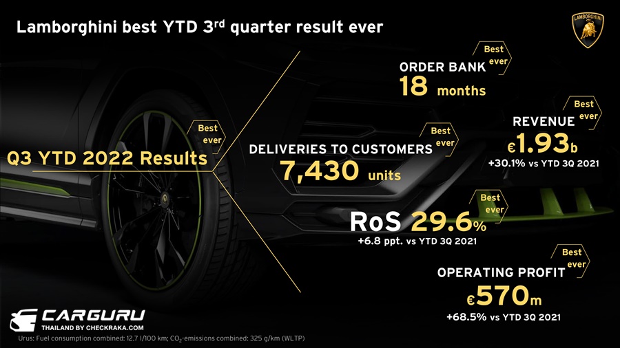 ออโตโมบิลี ลัมโบร์กินี พุ่งทะยานสู่การเติบโตที่รวดเร็วยิ่งกว่าทุกครั้งที่ผ่านมา เปิดเผยผลประกอบการ 9 เดือนแรกของปี 2022 สูงสุดเป็นประวัติการณ์เมื่อเปรียบเทียบกับช่วงเวลาเดียวกันของทุกปี พร้อมกันนี้ บริษัทซูเปอร์คาร์แห่ง ซาน ตากาตา ยังได้กล่าวอำลาต่อเครื่องยนต์สันดาป รุ่น V12 เพื่อให้สอดคล้องตามแผนการเปลี่ยนแปลงครั้งสำคัญในปีหน้าและมุ่งสู่การผลิตรถยนต์กลุ่มไฮบริดทั้งหมดภายในปี 2024