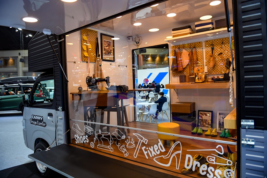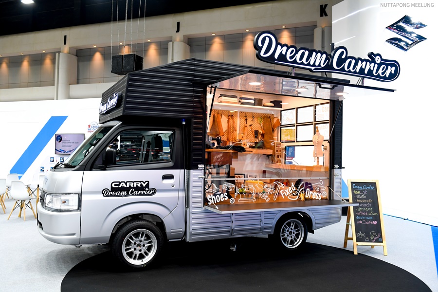 ในโซน Customized ทางซูซูกิยังคงนำรถหลากหลายรุ่นมาร่วมจัดแสดงภายในงาน เพื่อเป็นแนวทางสำหรับลูกค้าที่ชื่นชอบการตกแต่งรถที่ไม่เหมือนใคร ในครั้งนี้ซูซูกิจึงเสนอการนำ SUZUKI CARRY รถกระบะบรรทุกอเนกประสงค์มาตกแต่งในแนวคิด Dream Carrier บรรทุกฝันเพื่อวันสำเร็จ ไม่ว่าความฝันของคุณคืออะไร SUZUKI CARRY พร้อมช่วยต่อยอดความฝันให้ทุกคนได้เสมอ และด้วยสังคมการใช้ชีวิตของผู้คนในปัจจุบันนี้เปลี่ยนแปลงไป หลากหลายอาชีพที่เราเคยคุ้นตาถูกหลงลืมและหายไป ในอดีตเราเคยเห็นอาชีพช่างซ่อมเสื้อผ้าและรองเท้าดำเนินอยู่ตามร้านเล็กๆ หรือตามหัวมุมบาทวิถี โดยมีช่างผู้ชำนาญการประจำการพร้อมเครื่องมือหาเลี้ยงชีพ อาทิ จักรเย็บผ้าและอุปกรณ์ตัดเย็บต่างๆ หรือลังไม้ที่บรรจุอุปกรณ์ในการซ่อมรองเท้า วันนี้ SUZUKI CARRY มาต่อยอดความฝันขับเคลื่อนอาชีพช่างซ่อมเสื้อผ้าและรองเท้าให้กลับมามีชีวิตชีวาอีกครั้งบนรถกระบะบรรทุกฝัน เพื่อจะได้ขับออกไปให้บริการลูกค้าตามสถานที่ชุมชนต่างๆ ได้สะดวกยิ่งขึ้น โดยออกแบบพื้นที่ใช้สอยภายในรถ ให้สามารถทำงานไปได้ในเวลาเดียวกัน สะดวกทั้งเจ้าของธุรกิจและลูกค้าที่มาใช้บริการ นี่คืออีกครั้งหนึ่งที่ SUZUKI CARRY ตอกย้ำแนวคิด Carry Your Dream เคียงข้างทุกเส้นทางฝัน ได้อย่างชัดเจน ซึ่งเรามีเป้าหมายที่จะปรับเปลี่ยนรถกระบะบรรทุกให้เป็นรถขนส่งความสุขเคียงข้างทุกเส้นทางฝันทั้งในด้านธุรกิจและส่วนตัว รวมถึงการช่วยเหลือสังคมเหมาะสมกับการเป็นรถที่ครองใจผู้ประกอบการตัวจริง