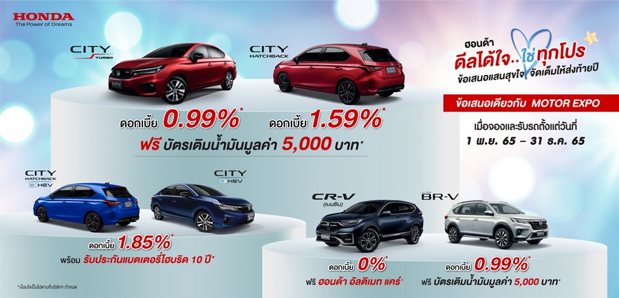 1 พฤศจิกายน 2565 - 31 ธันวาคม 2565 และข้อเสนอสุดพิเศษที่แตกต่างกันสำหรับรถยนต์แต่ละรุ่นได้ทั้งในงานและโชว์รูมฮอนด้าทั่วประเทศ สามารถสอบถามข้อมูลเพิ่มเติมได้ที่ศูนย์บริการข้อมูลฮอนด้า 24 ชั่วโมง โทร 0 2341 7777 หรือดูรายละเอียดเพิ่มเติมหรือแชทกับที่ปรึกษาการขายทางออนไลน์ผ่านเว็บไซต์
