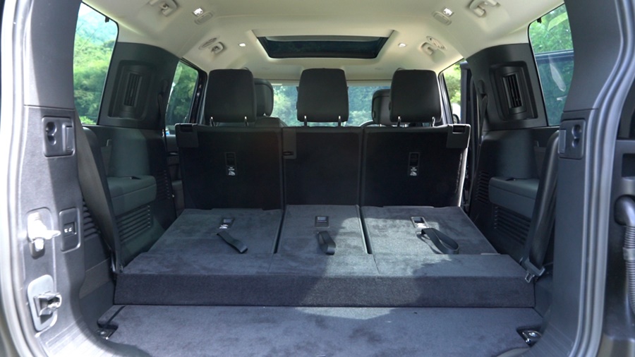 พื้นที่เก็บสัมภาระที่กว้างขวางและใช้งานได้สะดวก สามารถรับน้ำหนักสูงสุด 3,893 ลิตร แม้จะกางเบาะหลังสุดก็ตาม เมื่อไม่ได้ใช้งาน เบาะนั่งสามารถพับเก็บเพื่อเพิ่มพื้นที่เก็บสัมภาระขนาดใหญ่ได้ ทำให้ลูกค้าสามารถเลือกปรับแต่งการจัดวางภายในห้องโดยสารที่ตรงกับความต้องการมากที่สุด โดยแบ่งเป็นสัดส่วน 40:20:40 และยังสามารถลดระบบช่วงล่างถุงลมแบบอิเล็กทรอนิกส์ของดีเฟนเดอร์ลงด้วยปุ่มที่อยู่ภายในพื้นที่เก็บสัมภาระ เพื่อช่วยในการขนสัมภาระด้านท้ายรถ ในระดับที่เหมาะสม