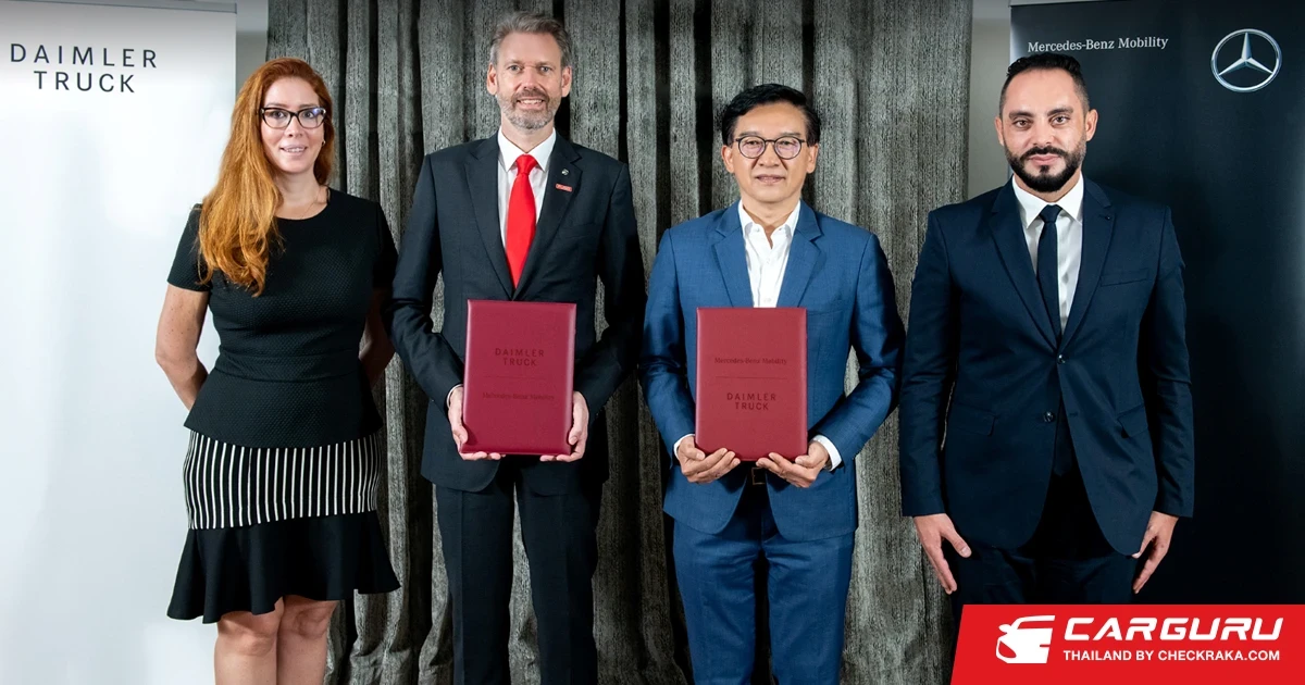 นายศุภวุฒิ จีรมนัสนาคร (ที่ 2 จากขวา) กรรมการผู้จัดการ บริษัท เมอร์เซเดส-เบนซ์ โมบิลิตี้ (ประเทศไทย) จำกัด และ มร. ราล์ฟ เครเมอร์ (ที่ 2 จากซ้าย) ประธานเจ้าหน้าที่บริหาร บริษัท เดมเลอร์ คอมเมอร์เชียล วีฮีเคิลส์ (ประเทศไทย) จำกัด ร่วมลงนามต่อสัญญาในการสนับสนุนบริการทางการเงินอย่างครบวงจรระหว่าง บริษัท เมอร์เซเดส-เบนซ์ โมบิลิตี้ (ประเทศไทย) จำกัด (MBLT) และ บริษัท เดมเลอร์ คอมเมอร์เชียล วีฮีเคิลส์ (ประเทศไทย) จำกัด (DCVT) ผู้จัดจำหน่ายรถเพื่อการพาณิชย์ภายใต้ แบรนด์เมอร์เซเดส-เบนซ์ และรถบรรทุกฟูโซ่ เพื่อสานต่อการทำงานร่วมกันตั้งแต่ปี 2560 เสริมสร้างความแข็งแกร่งของการบริการที่เป็นทางออกให้กับลูกค้าได้อย่างครบวงจร และเดินหน้าตอบโจทย์ความต้องการของผู้บริโภคในทุกกลุ่มเป้าหมาย ตลอดจนเครือข่ายตัวแทนจำหน่ายของ DCVT ได้อย่างต่อเนื่อง โดยมี มร. เซอร์จิโอ เซบาสทิอาวน์ (ขวาสุด) ประธานเจ้าหน้าที่ด้านการเงิน บริษัท เมอร์เซเดส-เบนซ์ โมบิลิตี้ (ประเทศไทย) จำกัด และ นางมายรา กุซชอว์ (ซ้ายสุด) ประธานเจ้าหน้าที่ด้านการเงินบริษัท เดมเลอร์ คอมเมอร์เชียล วีฮีเคิลส์ (ประเทศไทย) จำกัด ร่วมเป็นสักขีพยานในการเซ็นสัญญา ณ โรงแรมดับเบิลยู แบงค็อก เมื่อเร็ว ๆ นี้