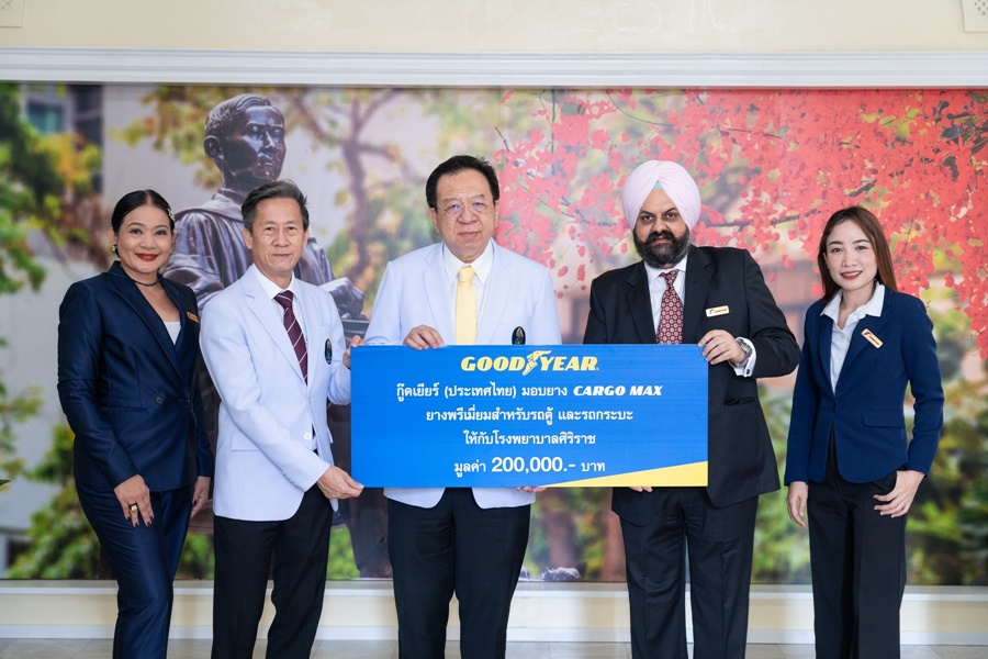 บริษัท กู๊ดเยียร์ (ประเทศไทย) จำกัด (มหาชน) นำโดย นายแรนดีพ ซิง กานวา (ที่สองจากขวา) กรรมการผู้จัดการ ส่งมอบยาง กู๊ดเยียร์ คาร์โก้ แมกซ์ ให้กับโรงพยาบาลศิริราชเพื่อนำไปใช้กับรถพยาบาลเพื่อความปลอดภัยในทุกเส้นทางการรับ-ส่งผู้ป่วย โดยมี รศ. นพ.วิศิษฎ์ วามวาณิชย์ (กลาง) ผู้อำนวยการโรงพยาบาลศิริราช และ ผศ. นพ.ธารา วงศ์วิริยางกูร (ที่สองจากซ้าย) รองผู้อำนวยการโรงพยาบาลศิริราช เป็นผู้แทนรับมอบ