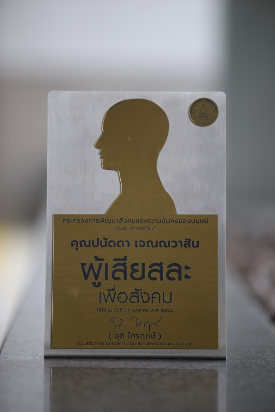 คุณปนัดดา เจณณวาสิน ประธานที่ปรึกษา บริษัท ตรีเพชรอีซูซุเซลส์ จำกัด รับมอบรางวัล "ผู้เสียสละเพื่อสังคม" จากนายจุติ ไกรฤกษ์ รัฐมนตรีว่าการกระทรวงการพัฒนาสังคมและความมั่นคงของมนุษย์