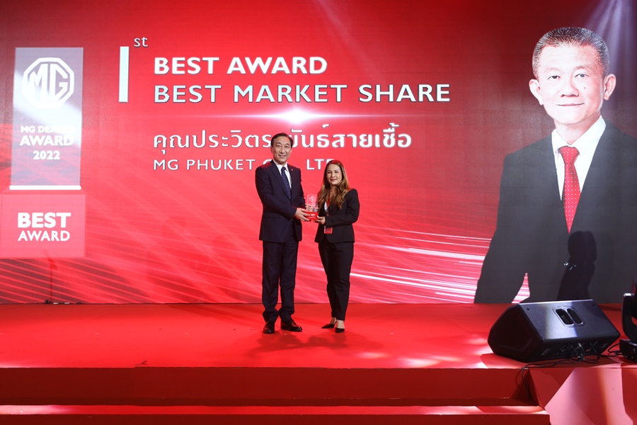 - ด้าน Market Share รางวัลพิเศษที่มอบให้แก่ผู้จำหน่ายที่ให้ความร่วมมือกับบริษัท และสร้างผลงานได้อย่างโดดเด่นใน “การร่วมกันสร้างส่วนแบ่งการตลาด” โดยพื้นที่จังหวัด ภูเก็ต มีส่วนแบ่งการตลาดของเอ็มจีสูงที่สุดในประเทศ โดยผู้ได้รับรางวัลดังกล่าว ประกอบด้วย 2 ผู้จำหน่าย ได้แก่ บริษัท ภูเก็ตปิยะเอ็มจี จำกัด และ บริษัท เอ็มจีลักซูรี่ หาดใหญ่ จำกัด (สาขาภูเก็ต)