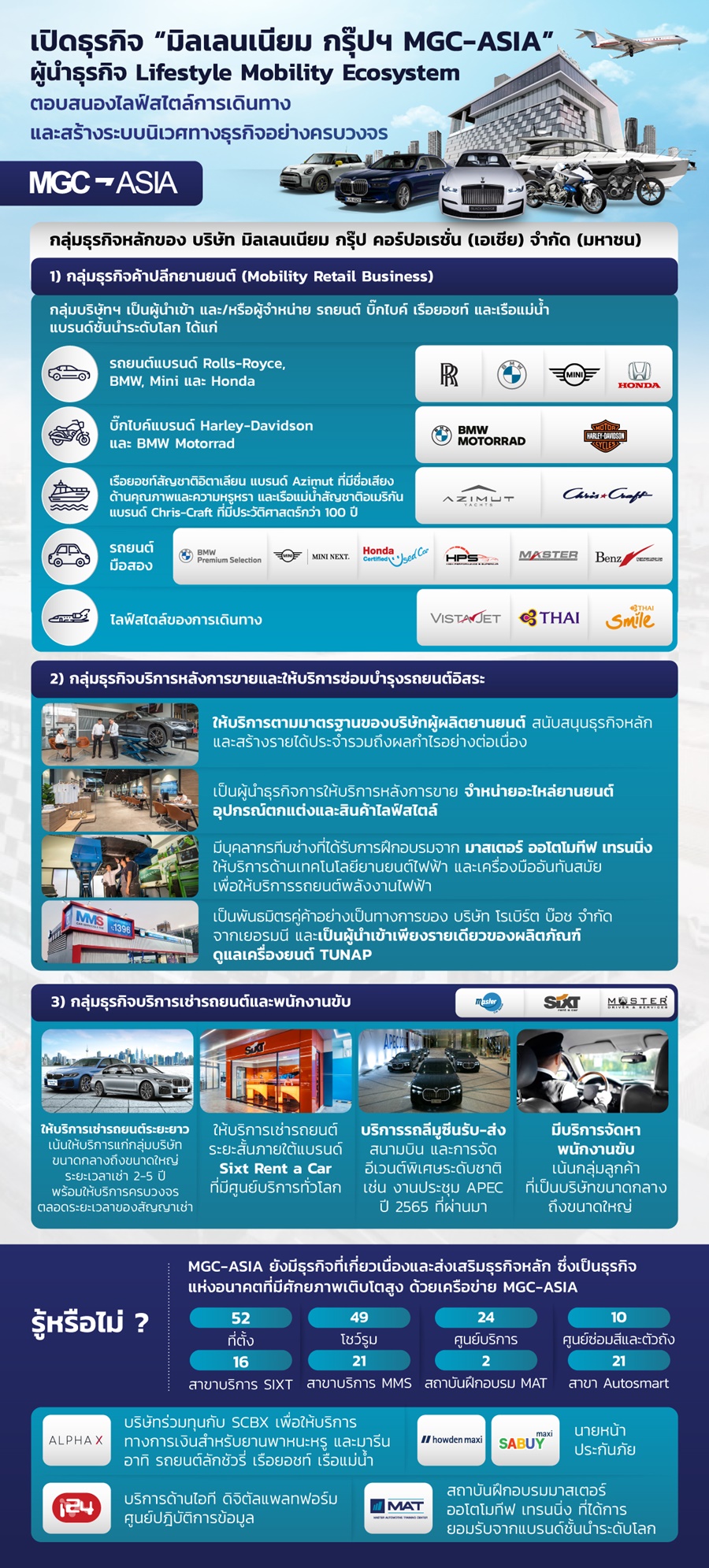 ดร.สัณหวุฒิ ธรรมชวนวิริยะ ประธานเจ้าหน้าที่บริหารกลุ่มบริษัท มิลเลนเนียม กรุ๊ป คอร์ปอเรชั่น (เอเชีย) จำกัด (มหาชน) เปิดเผยว่า มิลเลนเนียม กรุ๊ปฯ MGC-ASIA ดำเนินธุรกิจมากว่า 2 ทศวรรษ โดยสร้างความแข็งแกร่งด้วยการพัฒนาระบบนิเวศทางธุรกิจ (Business Ecosystem) ภายใต้ชื่อ ‘MGC-ASIA Ecosystem’ ผ่านการขยายผลิตภัณฑ์ บริการและฐานลูกค้า เพื่อตอกย้ำศักยภาพการเป็นผู้นำทางธุรกิจ ที่มุ่งตอบสนองไลฟ์สไตล์แห่งการเดินทางอย่างครบวงจร (Lifestyle Mobility) โดยปัจจุบัน มิลเลนเนียม กรุ๊ปฯ MGC-ASIA มีผลิตภัณฑ์และบริการอย่างครอบคลุม ทั้งการจำหน่ายรถยนต์ บิ๊กไบค์ เรือยอชท์ เรือแม่น้ำ และรถยนต์มือสอง พร้อมการรับประกัน บริการจัดหาลูกค้าสำหรับธุรกิจให้เช่าเครื่องบินเจ็ทส่วนตัว และตัวแทนจำหน่ายบัตรโดยสารสายการบินชั้นนำ บริการหลังการขายและซ่อมบำรุง บริการเช่ารถยนต์ทั้งระยะสั้นและระยะยาวพร้อมพนักงานขับ รวมถึงมีธุรกิจเสริมสร้างรายได้ระยะยาวและบริการอื่นๆ ได้แก่ บริการทางการเงินสำหรับยานยนต์และมารีน นายหน้าประกันภัย และบริการด้านเทคโนโลยีสารสนเทศ (IT) และศูนย์ปฏิบัติการข้อมูล เป็นต้น นอกจากนี้ การร่วมมือกับพันธมิตร ซึ่งเป็นผู้ผลิตและให้บริการด้านยานยนต์ระดับโลกมาอย่างต่อเนื่อง ช่วยเสริมสร้างให้เกิดโอกาสทางธุรกิจใหม่ๆ ที่เกี่ยวเนื่อง เพื่อสร้างประสบการณ์ที่ดีและครบวงจรแก่ลูกค้า รวมถึงสร้างความแตกต่างจากผู้ประกอบการรายอื่น