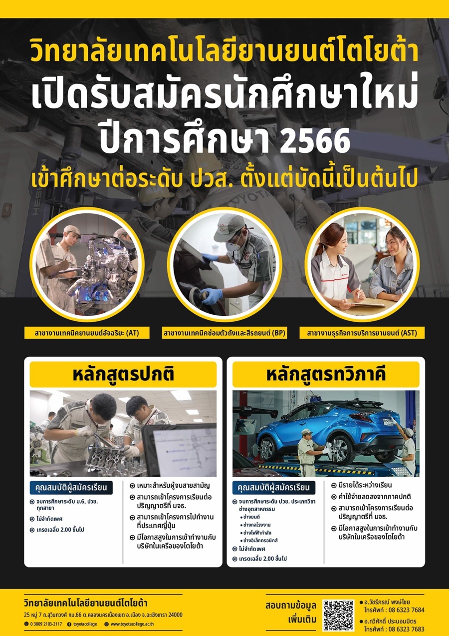 วิทยาลัยเทคโนโลยียานยนต์โตโยต้า เปิดรับสมัครนักศึกษาใหม่ เข้าศึกษาระดับประกาศนียบัตรวิชาชีพชั้นสูง (ปวส.) ปีการศึกษา 2566 ภายใต้หลักสูตรอาชีวศึกษา ร่วมกับหลักสูตรการอบรมตามมาตราฐาน บริษัท โตโยต้า มอเตอร์ คอร์ปอเรชั่น ประเทศญี่ปุ่น