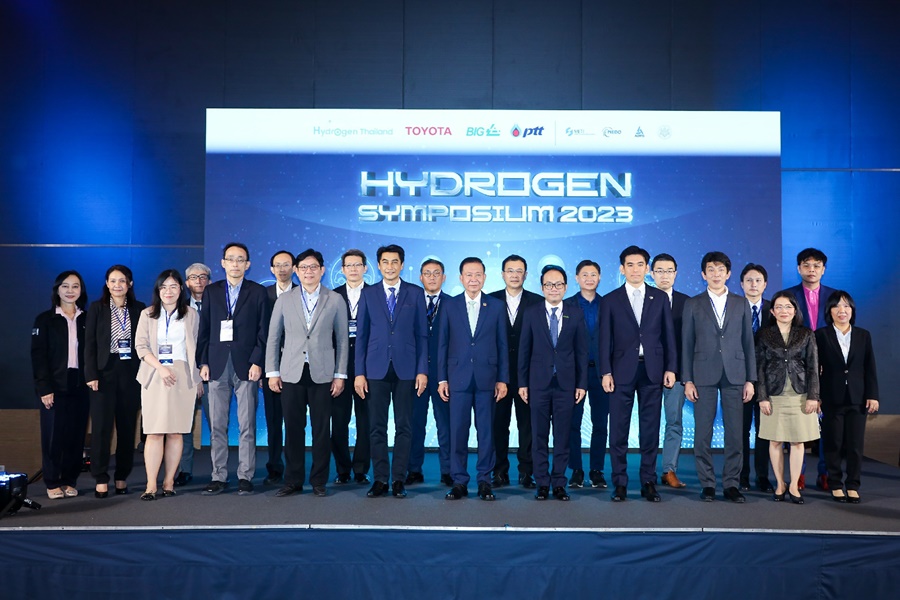 นายนินนาท ไชยธีรภิญโญ ประธานคณะกรรมการ บริษัท โตโยต้า มอเตอร์ ประเทศไทย จำกัด และประธาน Hydrogen Thailand Club, นายปิยบุตร จารุเพ็ญ กรรมการผู้จัดการ บริษัท บางกอกอินดัสเทรียลแก๊ส จำกัด, นายยุทธนา สุวรรณโชติ ผู้ช่วยกรรมการผู้จัดการใหญ่ สถาบันนวัตกรรม บริษัท ปตท. จำกัด (มหาชน) และ นายโชทาโร่ ซาโนะ ผู้ช่วยทูตฝ่ายพาณิชย์ สถานเอกอัครราชทูตญี่ปุ่นประจำประเทศไทย พร้อมด้วยคณะผู้บริหารระดับสูงจากหน่วยงานภาครัฐ และภาคเอกชนที่เกี่ยวข้องเข้าร่วมงานสัมมนา Hydrogen Symposium 2023 ภายใต้แนวคิด Gearing towards Carbon Neutrality with Hydrogen Society เพื่อส่งเสริมความรู้ ความเข้าใจเกี่ยวกับเทคโนโลยีไฮโดรเจน ผ่านการเผยแพร่ตัวอย่างความสำเร็จของโครงการจากองค์กรต่างๆ ทั้งใน และต่างประเทศ เพื่อเป็นส่วนหนึ่งในการผลักดันไฮโดรเจนให้เป็นพลังงานทางเลือกใหม่แห่งอนาคต ในการมุ่งสู่เป้าหมายความเป็นกลางทางคาร์บอนของประเทศไทย ณ ห้องบอลรูม โรงแรมฮอลิเดย์ อินน์ พัทยา เมื่อวันที่ 23 กุมภาพันธ์ ที่ผ่านมา