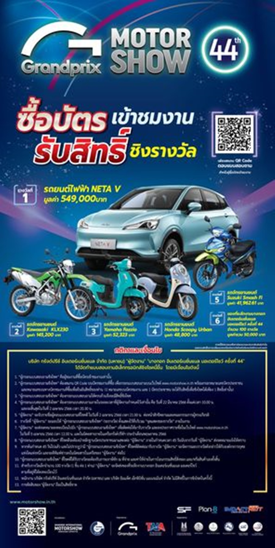 2.เมื่อผู้เข้าชมจองรถยนต์ และ รถจักรยานยนต์ภายในงานบางกอก อินเตอร์เนชั่นแนลมอ เตอร์โชว์ ครั้งที่ 44 ลุ้นรับรางวัลเป็นรถยนต์และรถจักรยานยนต์ ดังนี้