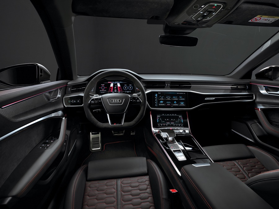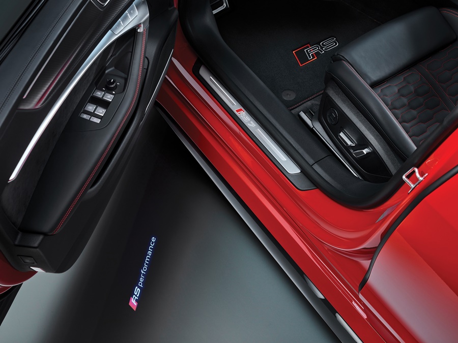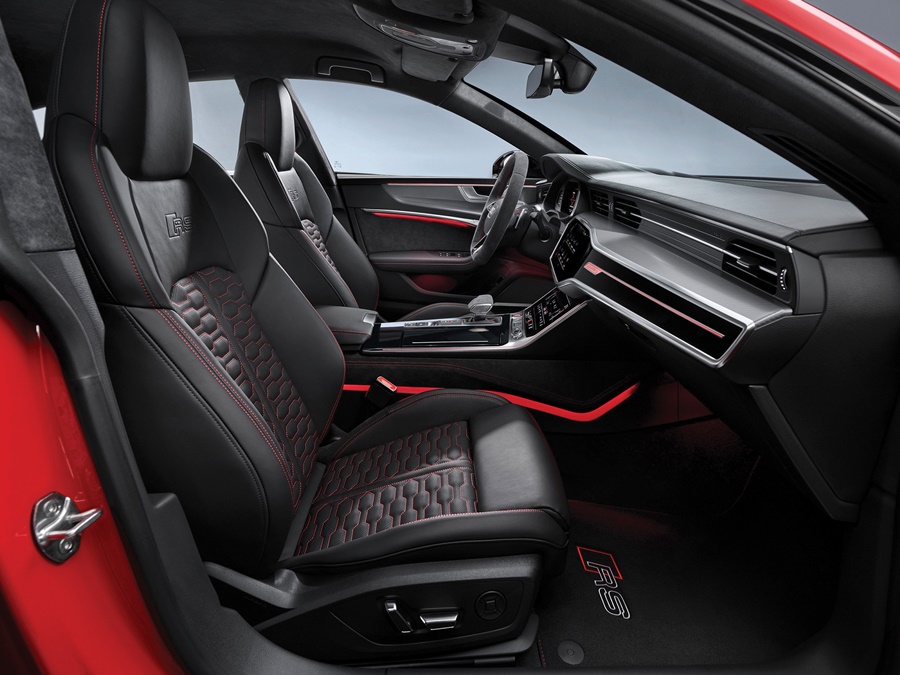 RS 7 Sportback Performance ออกแบบภายในอย่างพิถีพิถัน สร้างบรรยากาศการขับขี่ให้เอ็กซ์คลูซีฟยิ่งกว่าเดิม ด้วยเบาะนั่งคู่หน้าแบบ RS Sports ตกแต่งแบบ honeycomb และด้ายสีแดง เบาะนั่งผู้โดยสารด้านหลังหุ้มหนัง Valcona ห้องโดยสารตกแต่งลาย Carbon Twill Structure พร้อมไฟเรืองแสงห้องโดยสาร ที่ปรับได้มากถึง 30 เฉดสี
