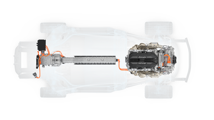 ชุดเกียร์ 8 สปีดรุ่นใหม่ถูกวางตำแหน่งตามขวางด้านหลังเครื่องยนต์ V12 ที่วางตามแนวยาว เพื่อเว้นเนื้อที่ในท่อระบบส่งกำลังสำหรับการติดตั้งแบตเตอรี่ลิเธียมไอออนที่จะเป็นตัวให้พลังงานแก่มอเตอร์ไฟฟ้า ถือเป็นโซลูชันทางเทคนิคอันยอดเยี่ยมในโลกยานยนต์สมรรถนะสูง และยกระดับให้ลัมโบร์กินีขึ้นแท่นผู้นำด้านวิศวกรรมยานยนต์อีกครั้ง การวางเลย์เอาต์ลักษณะนี้ยังช่วยรักษาตำแหน่งของฐานล้อและเสริมการกระจายน้ำหนักให้ดีขึ้นเพื่อเสริมระบบพลศาสตร์การขับขี่ให้ดีที่สุด