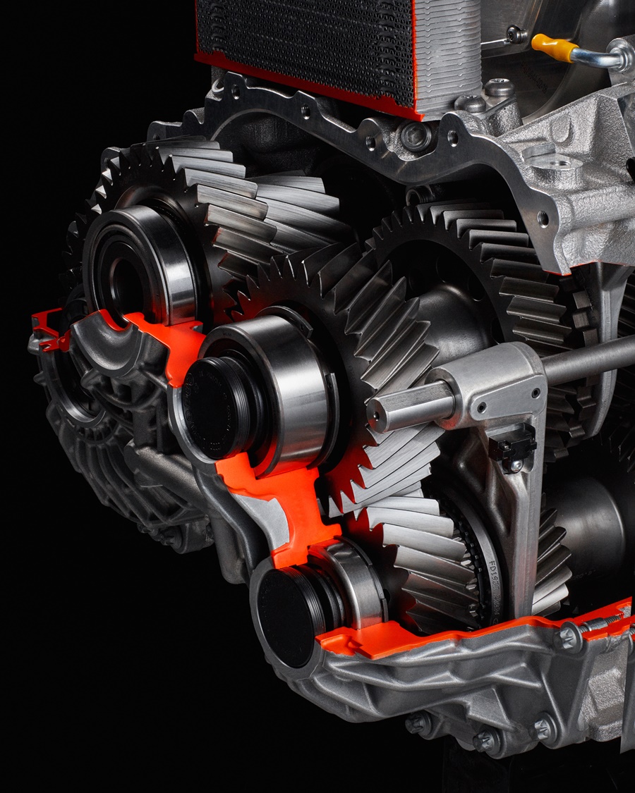 ชุดเกียร์ดับเบิลคลัตช์มีขนาดกะทัดรัดมาก โดยยาวเพียง 560 มม. กว้าง 750 มม. และสูง 580 มม. เท่านั้น น้ำหนักรวมเพียง 193 กิโลกรัม ซึ่งรวมถึงชิ้นส่วนพื้นฐานใหม่ในโครงสร้างรถยนต์ไฮบริดด้วย นั่นคือมอเตอร์ไฟฟ้าส่วนหลังซึ่งมีกำลังไฟ 10 กิโลวัตต์และแรงบิดสูงสุด 150 นิวตันเมตร