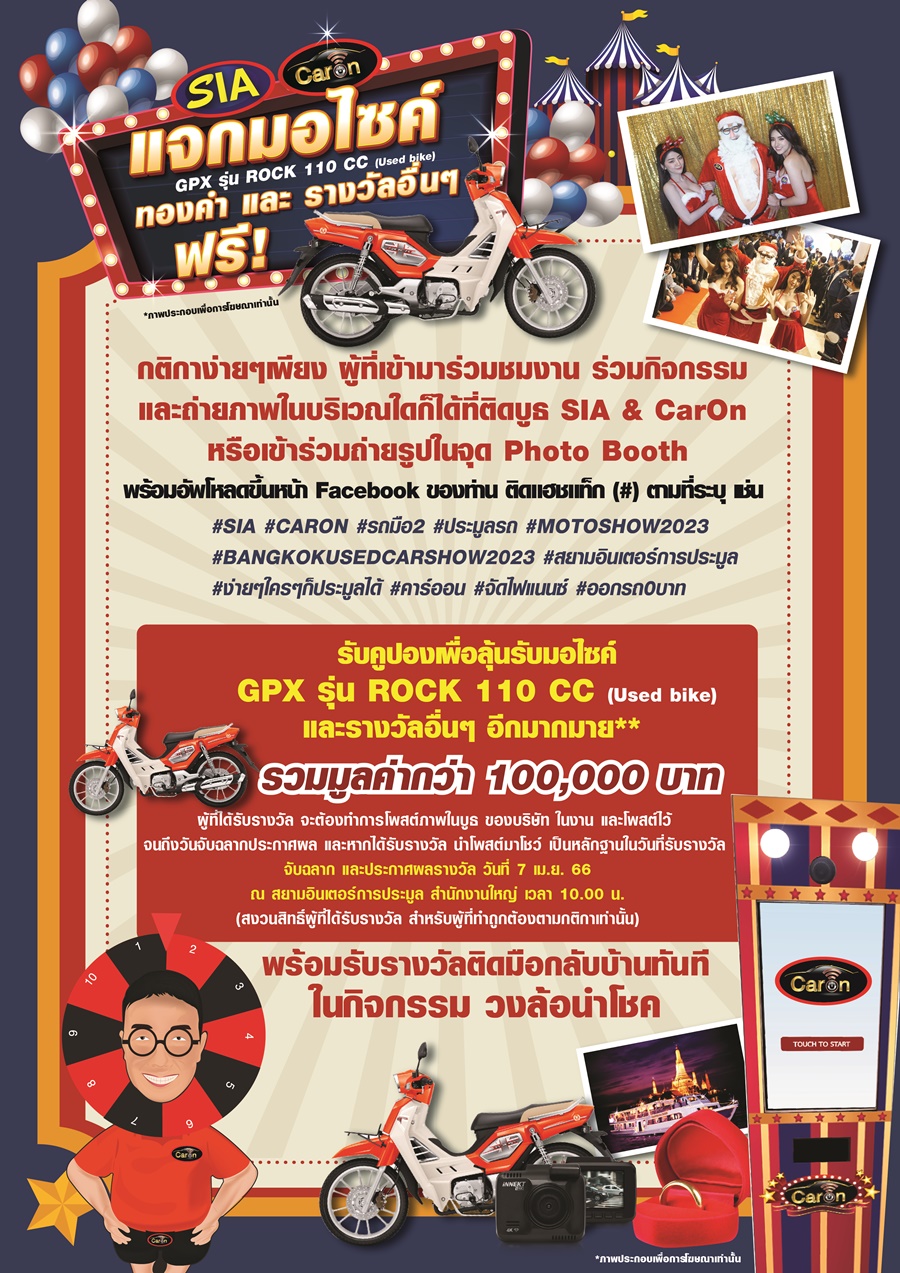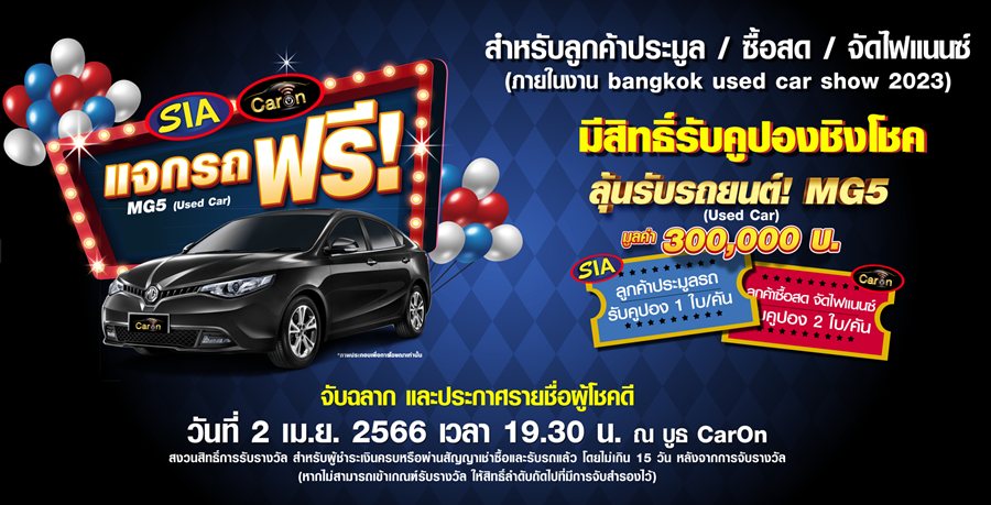 ซึ่งจะดำเนินการจับฉลากและประกาศรายชื่อผู้โชคดี ลุ้นรับรถยนต์ ในวันสุดท้ายของงาน วันอาทิตย์ ที่ 2 เมษายน 2566 เวลา 19.30 น. ณ บูท CarOn (U10)