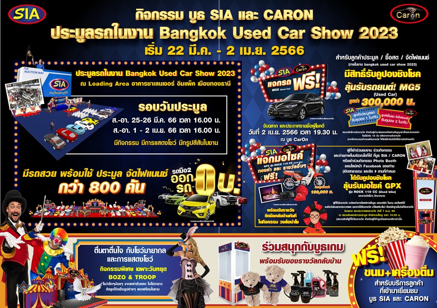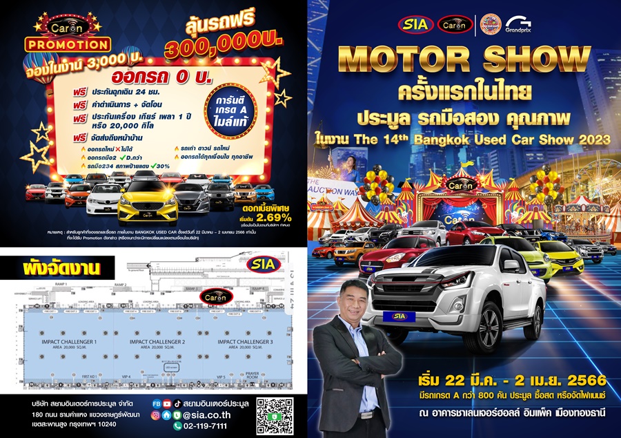 บริษัท สยามอินเตอร์ การประมูล จำกัด ผู้ให้บริการธุรกิจซื้อขายรถมือสองในรูปแบบการประมูล ดำเนินธุรกิจมาแล้วกว่า 19 ปี ขายสินค้าไปแล้วมากกว่า 300,000 รายการ และมีลูกค้าทั่วประเทศมากกว่า 30,000 ราย และ บริษัท คาร์ออน จำกัด ได้เตรียม รถยนต์มือสอง คัดคุณภาพ พร้อมใช้ บริการ สำหรับลูกค้า กว่า 800 คัน ในงาน Bangkok used car show 2023 ครั้งที่ 14 ในวันที่ 22 มีนาคม – 2 เมษายน 2566 อีกทั้งถือเป็นครั้งแรกในไทย ที่มีการจัดงานประมูล รถยนต์มือสอง คุณภาพ ในงาน มหกรรมรถยนต์มือสอง ซึ่งจัดพร้อมกันกับ งาน บางกอก อินเตอร์เนชั่นแนล มอเตอร์ โชว์