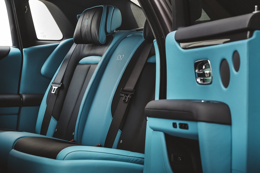 ภายในห้องโดยสารได้ผ่านการคัดสรรวัสดุอย่างพิถีพิถัน เบาะหนังสีดำ ตัดกับสีฟ้า Turchese อย่างลงตัว พร้อมติดตั้งโลโก้สัญลักษณ์ Infinity ที่มีเฉพาะสายพันธุ์ แบล็กแบดจ์ บริเวณนาฬิกา เบาะหลัง และกาบบันได ขณะที่แดชบอร์ดติดตั้ง Technical Fiber Veneer ที่เกิดจากการนำเส้นใยคาร์บอนและเส้นใยโลหะ มาถักทอด้วยมือเป็นลายข้าวหลามตัด เคลือบด้วยน้ำยาเรซินให้ดูแวววาวแบบ 3 มิติ
