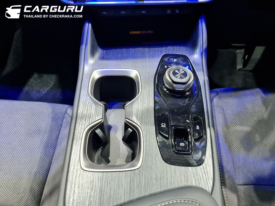- ปุ่มควบคุมเกียร์แบบหมุน ติดตั้งอยู่บริเวณคอนโซลกลาง เปลี่ยนเกียร์ได้สะดวกสบายด้วยการกดและหมุนไปตามตำแหน่งที่ต้องการ สั่งการด้วยระบบ Shift-by-Wire ให้ความรู้สึกมั่นคง และแม่นยำ พร้อมมอบเอกลักษณ์แบบรถไฟฟ้า BEV อย่างแท้จริง